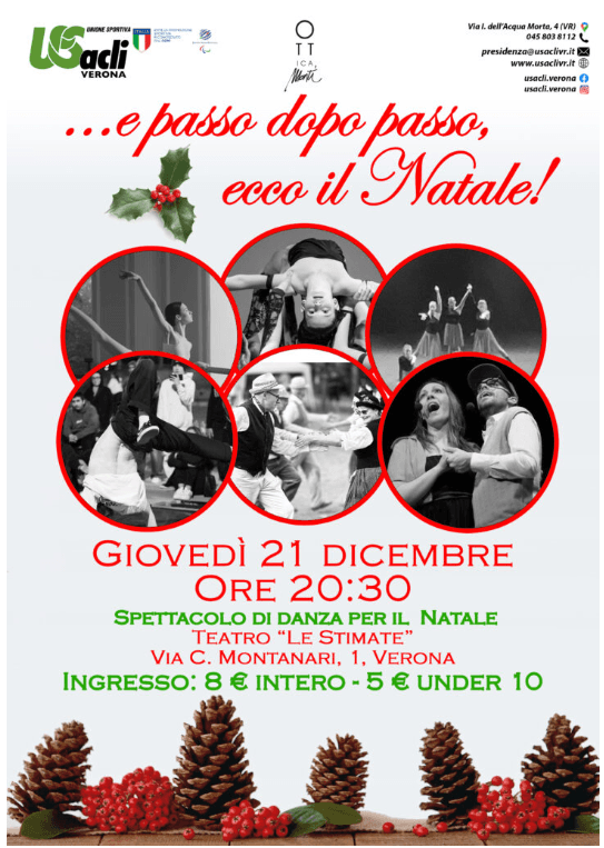 Giovedì 21 dicembre alle 20:30 presso il teatro “Le Stimate”, USacli di Verona presenta lo spettacolo di danza “… e passo dopo passo, ecco il Natale”, che vedrà la partecipazione di 6 scuole di danza a noi affiliate.