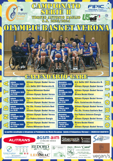 Dal 2 dicembre 2023 al 27 aprile 2024 Olympic Basket Verona parteciperà al Campionato di Serie B – Trofeo Antonio Maglio di basket in carrozzina.