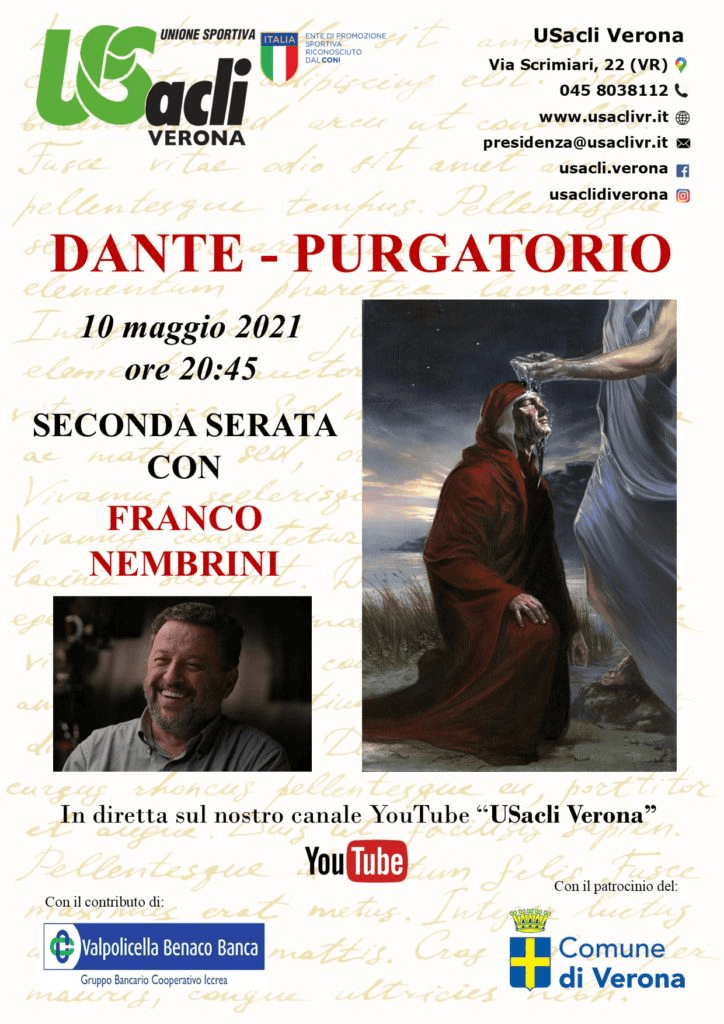 Questa sera, ore 20:45, il Purgatorio di Dante Alighieri raccontato da FRANCO NEMBRINI in diretta sul nostro canale YouTube “USacli Verona”!