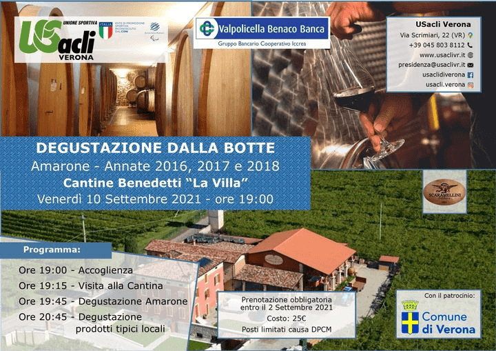 Venerdì 10 settembre 2021, alle ore 19:00, presso le Cantine Benedetti “La Villa” di Negrar organizzeremo per la prima volta la spillatura direttamente dalla botte di Amarone (annate 2016, 2017 e 2018).