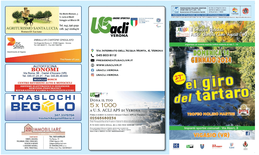 Domenica 14 gennaio 2024, USacli di Verona e Olimpia Club Vigasio vi invitano a partecipare alla 27^ edizione de El Giro del Tartaro, una marcia podistica ludico-motoria di 7-14 km a Vigasio, in provincia di Verona.