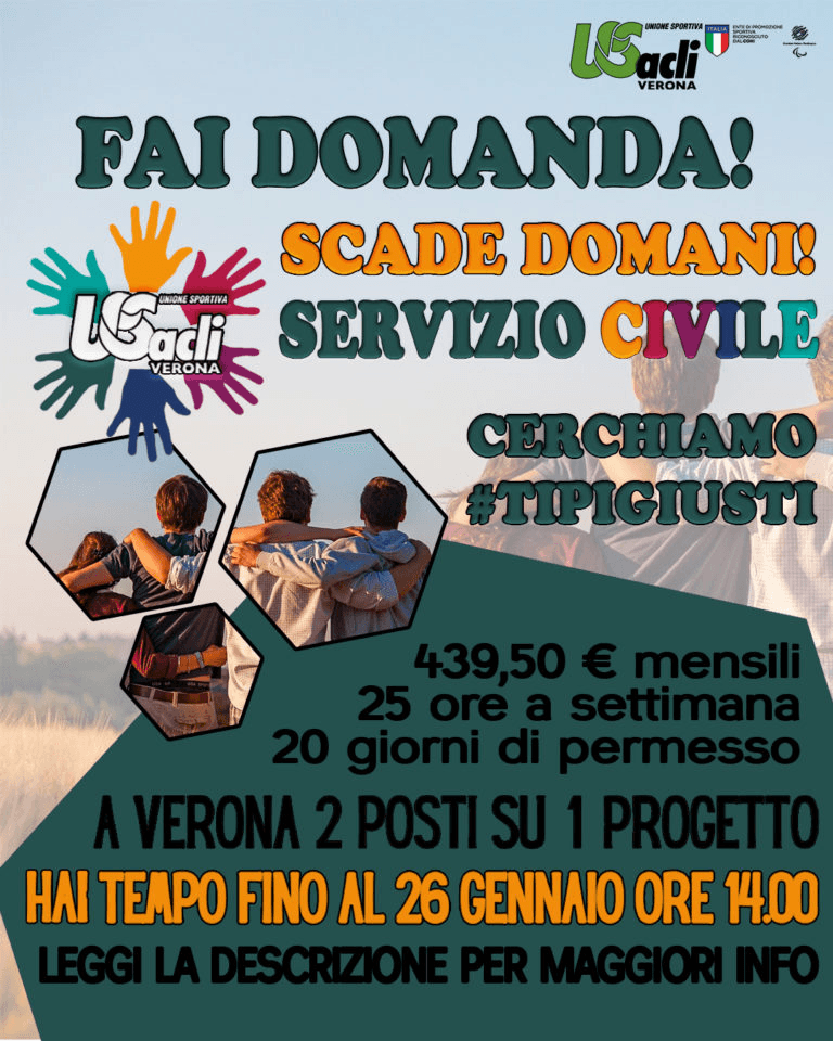 Hai tempo solo fino a domani, 26 gennaio, ore 14:00, per fare domanda di #serviziocivile presso USacli di Verona.